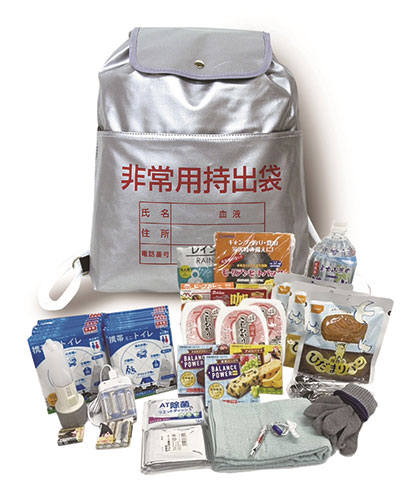 非常用持ち出し袋、飲料水2L、レトルトごはん3パック、レトルトおかず3種、ヒートパック3回分、パン3食、バランス栄養食3食、スプーン3本、携帯電話用充電器、ランタン機能付懐中電灯、予備電池、緊急用呼子笛、携帯簡易トイレ12回分、タオル、除菌ウェットティッシュ、アルミ防寒シート、レインウェア、作業用手袋