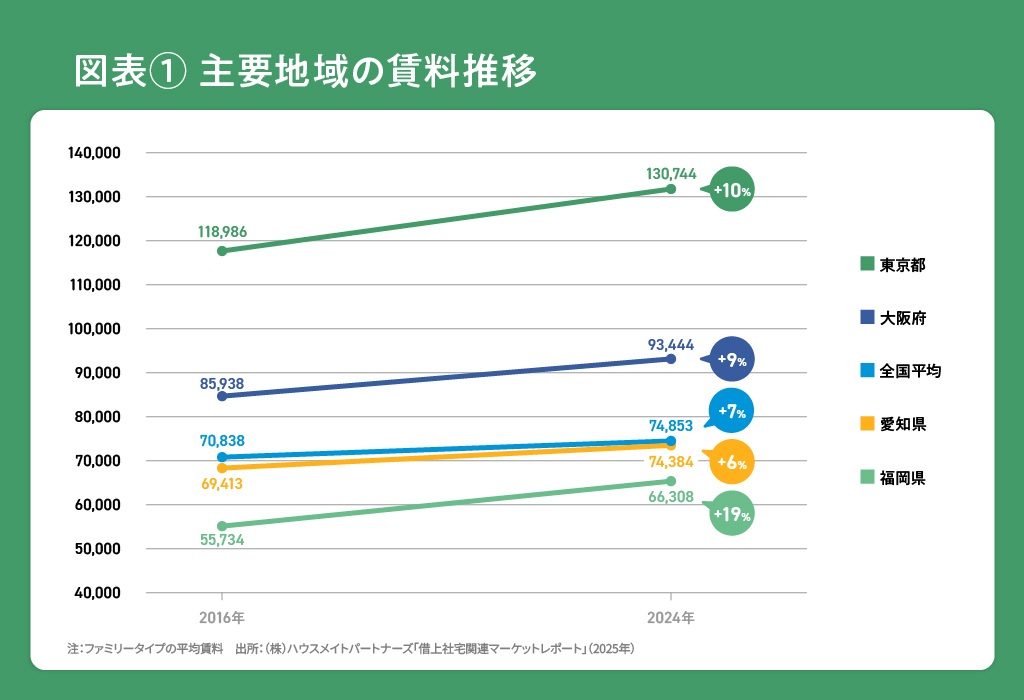 全国的に賃料が上がっていますね。全国平均では、8年間で6%増、大都市部ではもっと上がっています。同じ賃料帯では従来とは物件が異なってきますね。