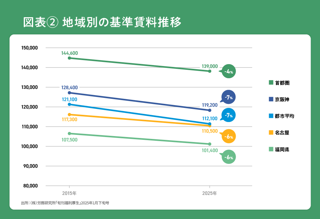 でも、社宅規程が定める基準賃料は引き上げられていません。「旬刊福利厚生」の調査では、基準賃料は2015年と2025年の10年間では、図表②のように、上がるどころか下がっています。都市部平均で7%も下がっています。そのため、ここ数年の急激な賃料上昇に規程が追いついていません。
