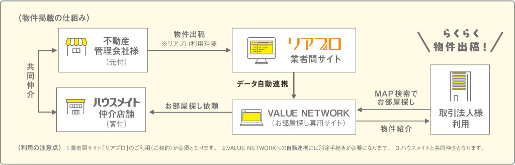 Value Networkは、仲介業者さま向け不動産ポータル 『リアプロ※』 と連携しています。 『リアプロ』に掲載された物件が、そのまま自動でValue Networkにも反映されるため、 新たな作業は不要です。なお、データ連動費用としてリアプロ側に月額10,000円が発生します。