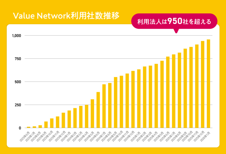 現在、Value Networkは 950社(約10万件)の法人社宅の転勤にご利用いただけるサービスへと成長しました。 物件掲載も 136,000件/518店舗(2025年10月時点) となっています。
