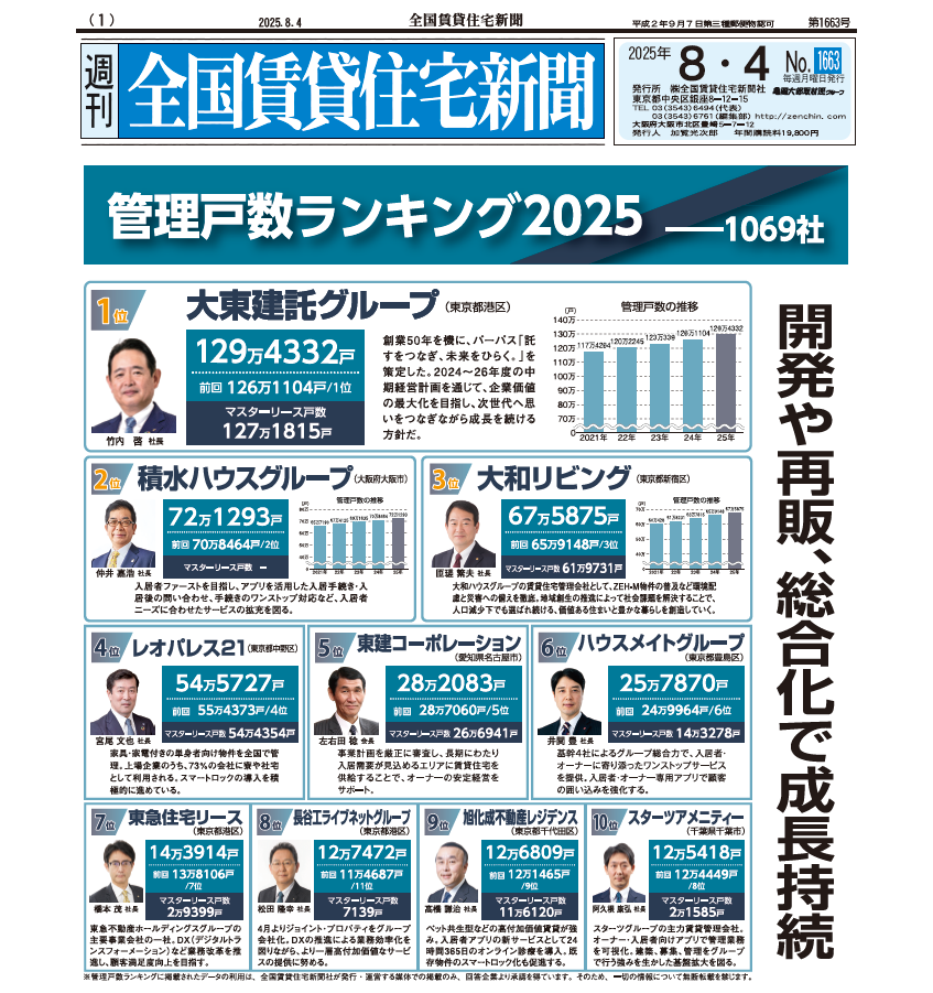 株式会社全国賃貸住宅新聞社が全国の賃貸管理会社を対象に実施したアンケート調査に基づく「賃貸管理戸数ランキング」が、2025年8月4日発行の『全国賃貸住宅新聞』にて発表された。